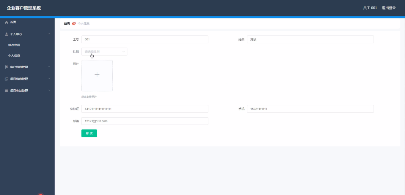 个人信息,在个人信息页面中可以查看工号、姓名、性别、照片、身份证、手机、邮箱等信息内容,并且根据需要对已有个人信息进行修改等其他详细操作,如图5-10所示。